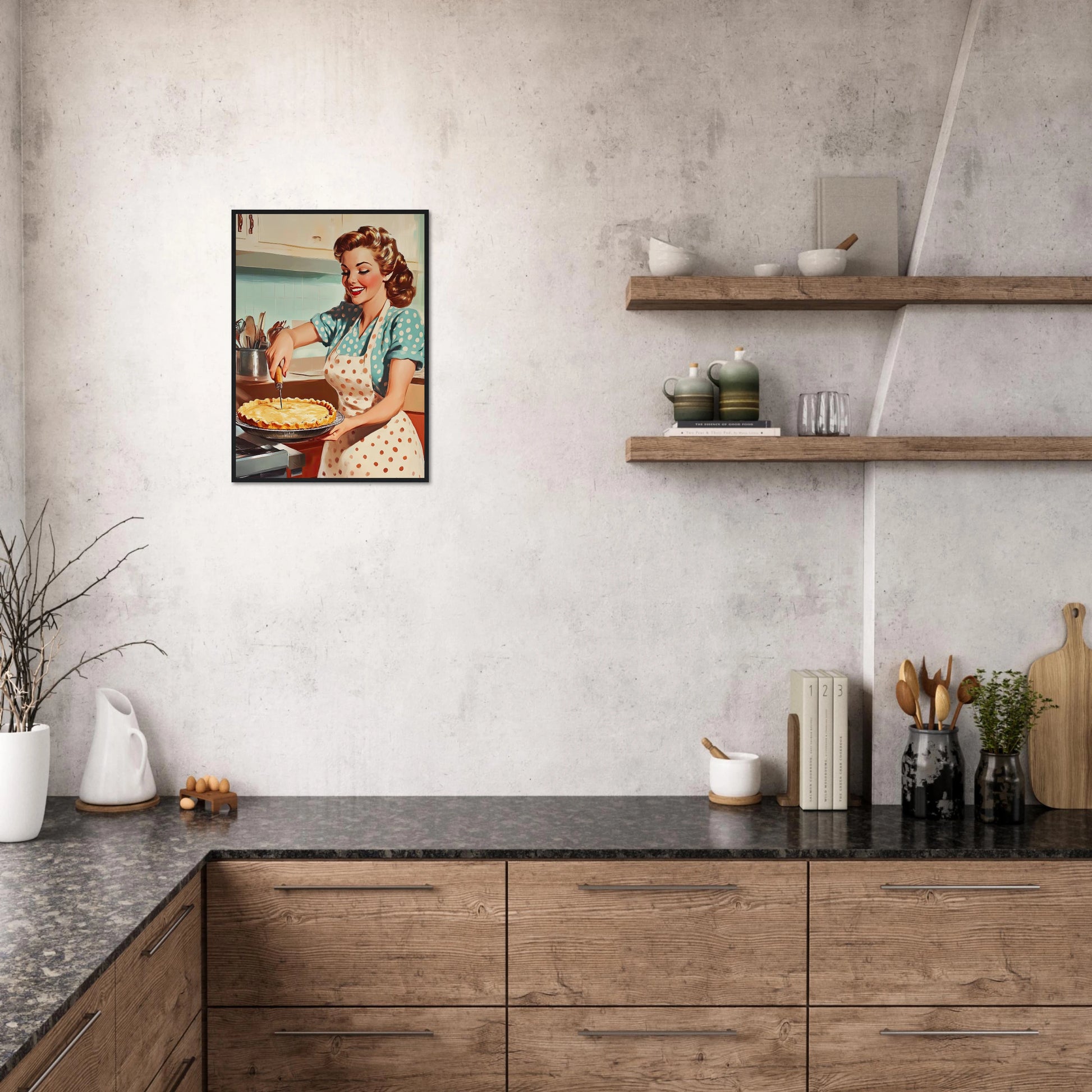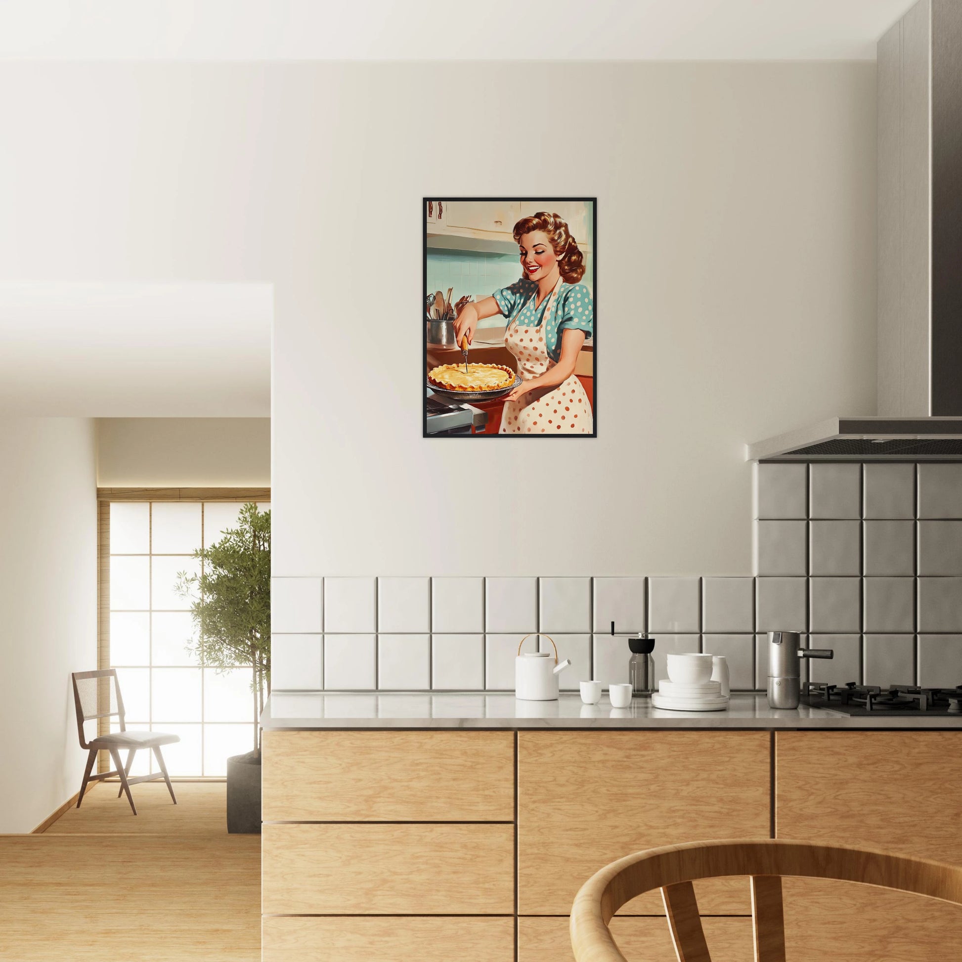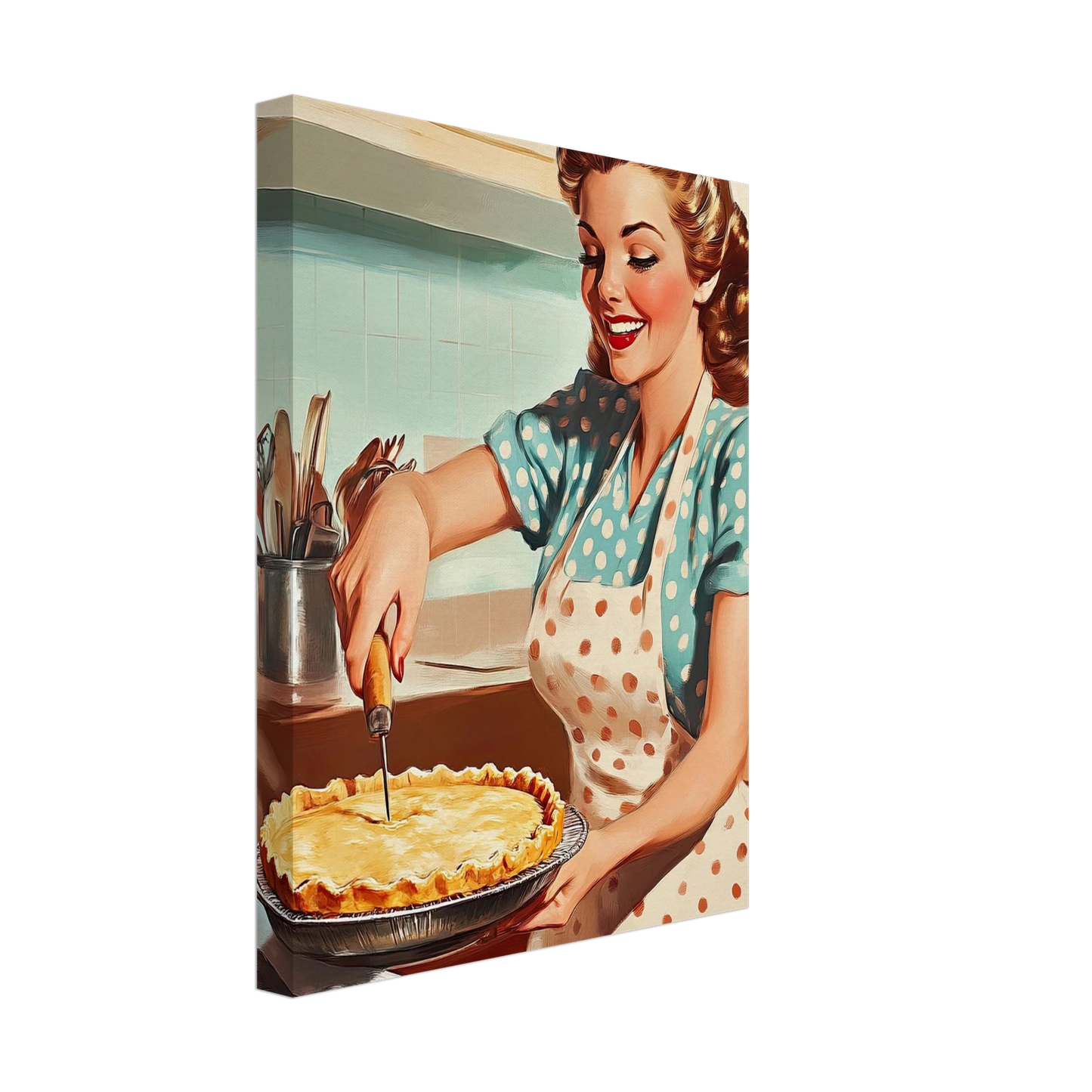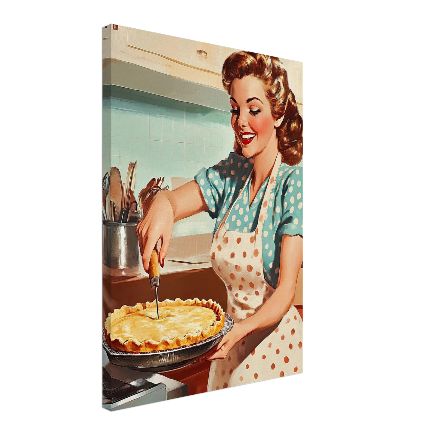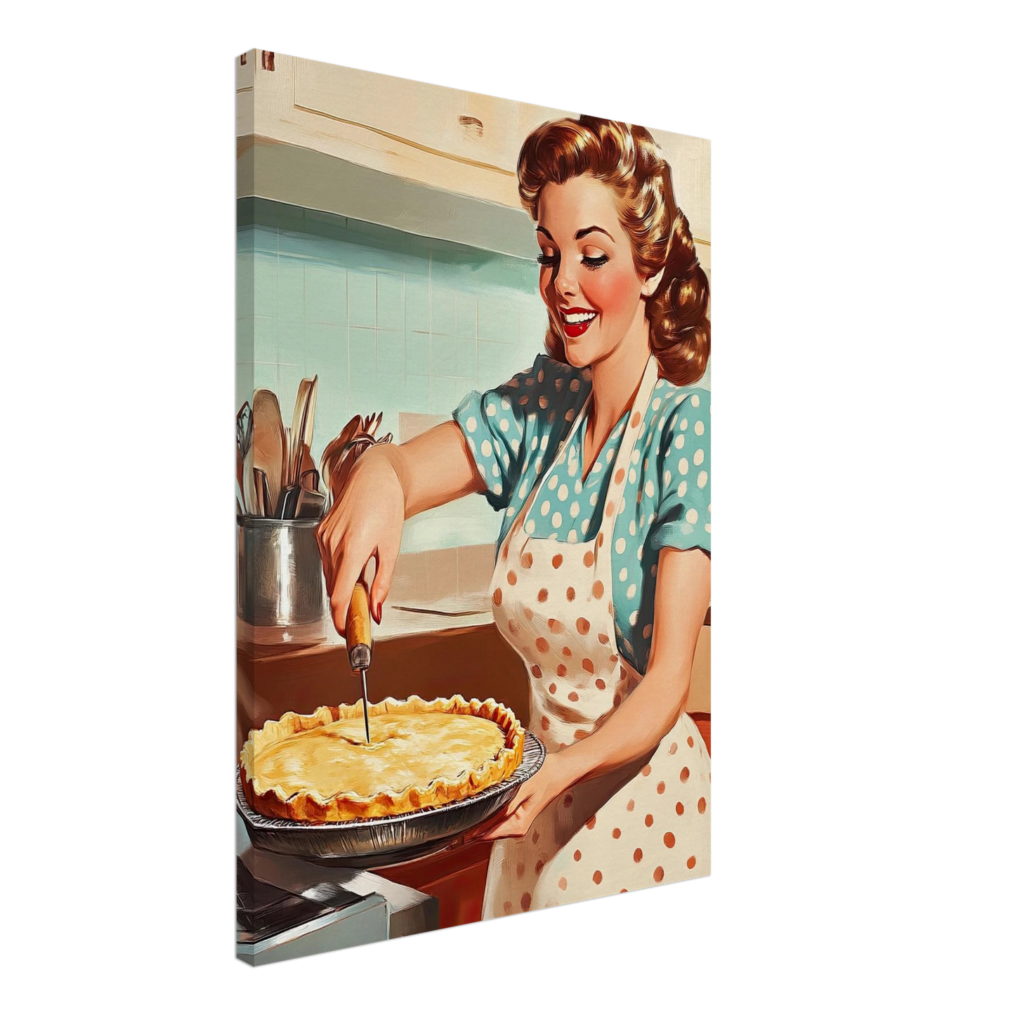 Et sjarmerende vintage-motiv i ekte 50-talls stil, med en smilende kvinne som serverer en nybakt pai på kjøkkenet. De klare fargene, de karakteristiske detaljene og den nostalgiske stemningen fanger essensen av hjemmekos og tidsriktig retro-estetikk. Perfekt kunstverk for deg som vil tilføre interiøret varme, glede og klassisk nostalgi.