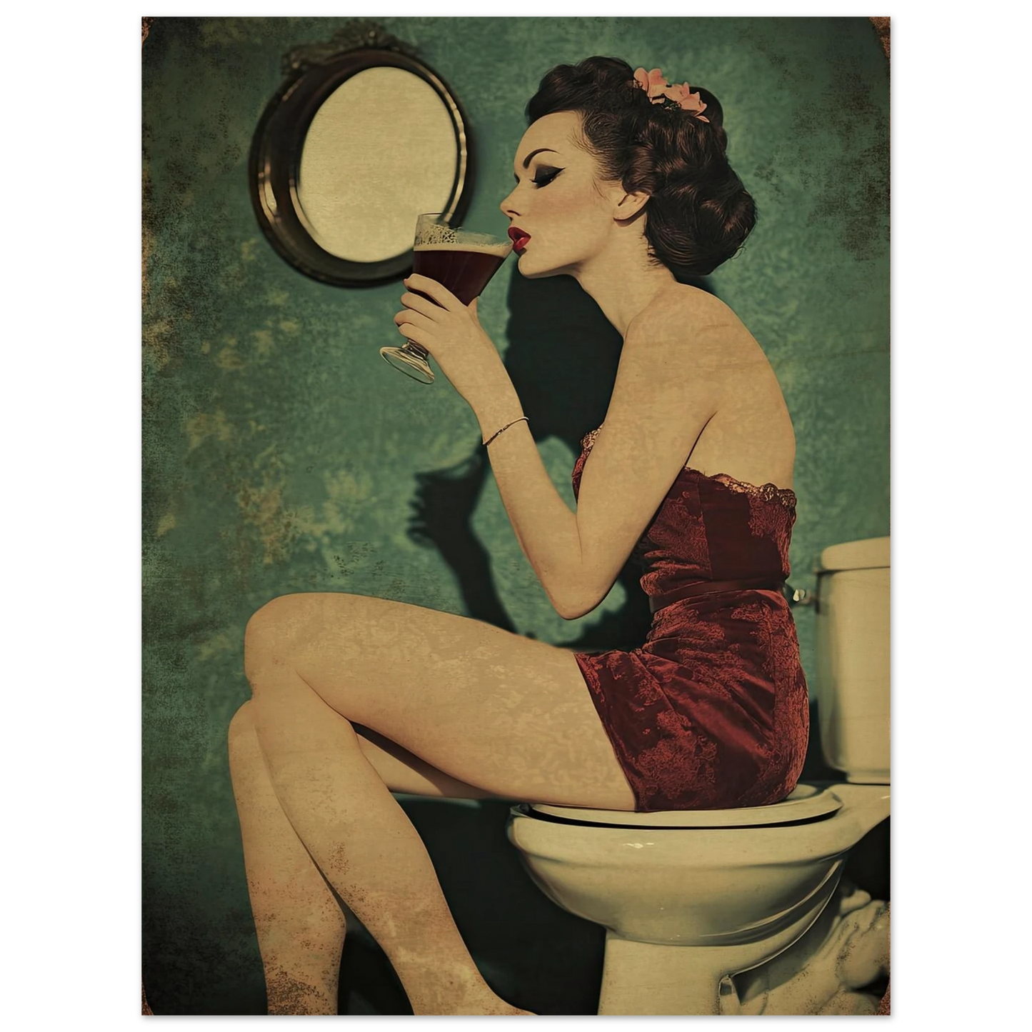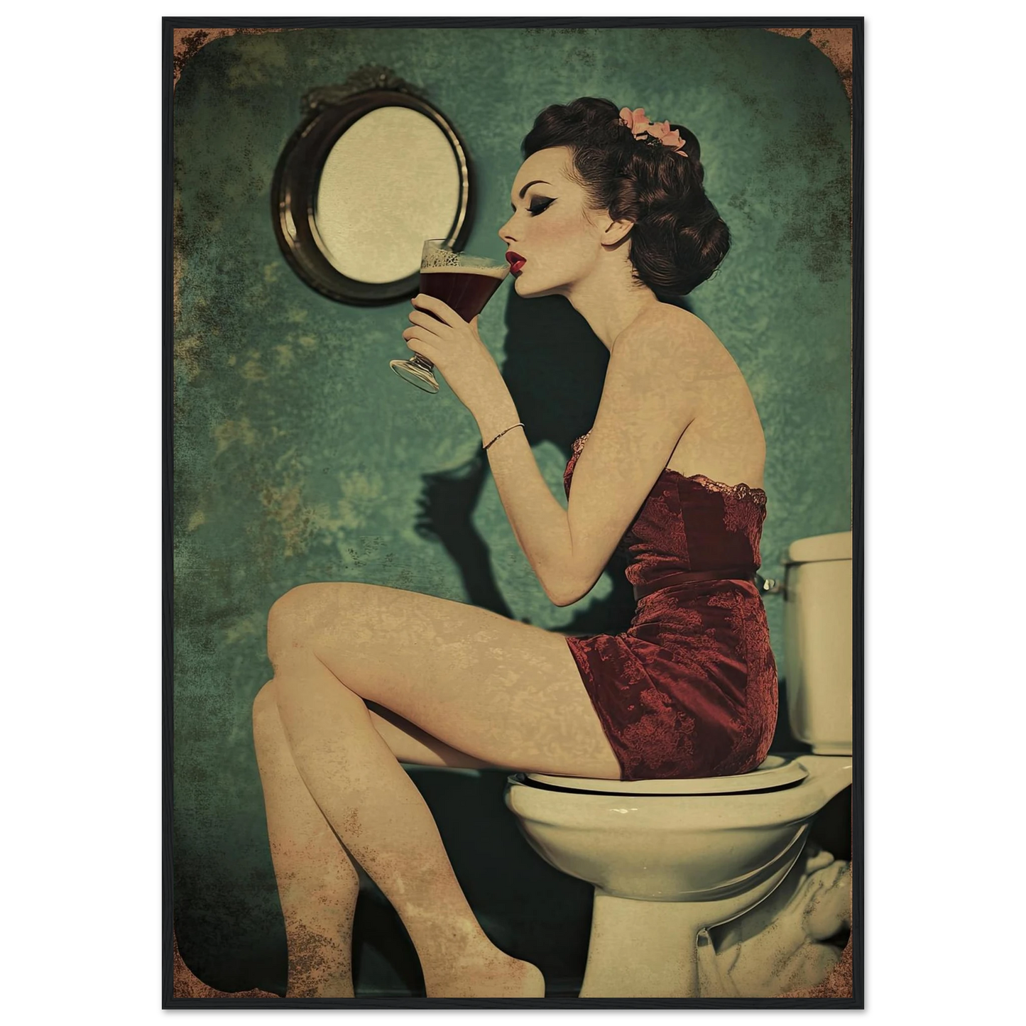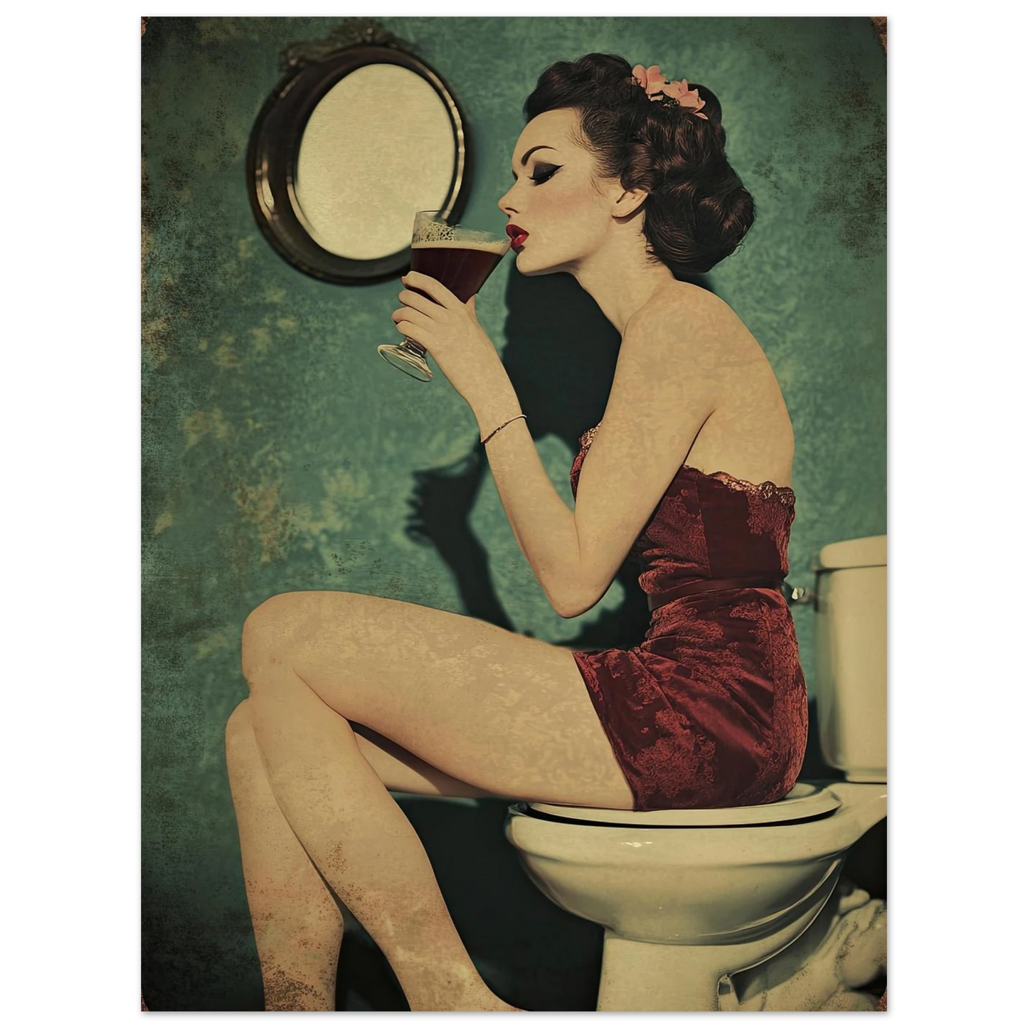 Et dristig vintage-motiv som kombinerer klassisk pin-up-estetikk med en uventet og provoserende setting. Kontrasten mellom elegansen i antrekket, glamouren i posituren og den hverdagslige bakgrunnen gir bildet en unik blanding av humor, stil og attityde. Perfekt kunstverk for deg som ønsker et blikkfang som utfordrer normene og tilfører interiøret en edgy retro-vri.