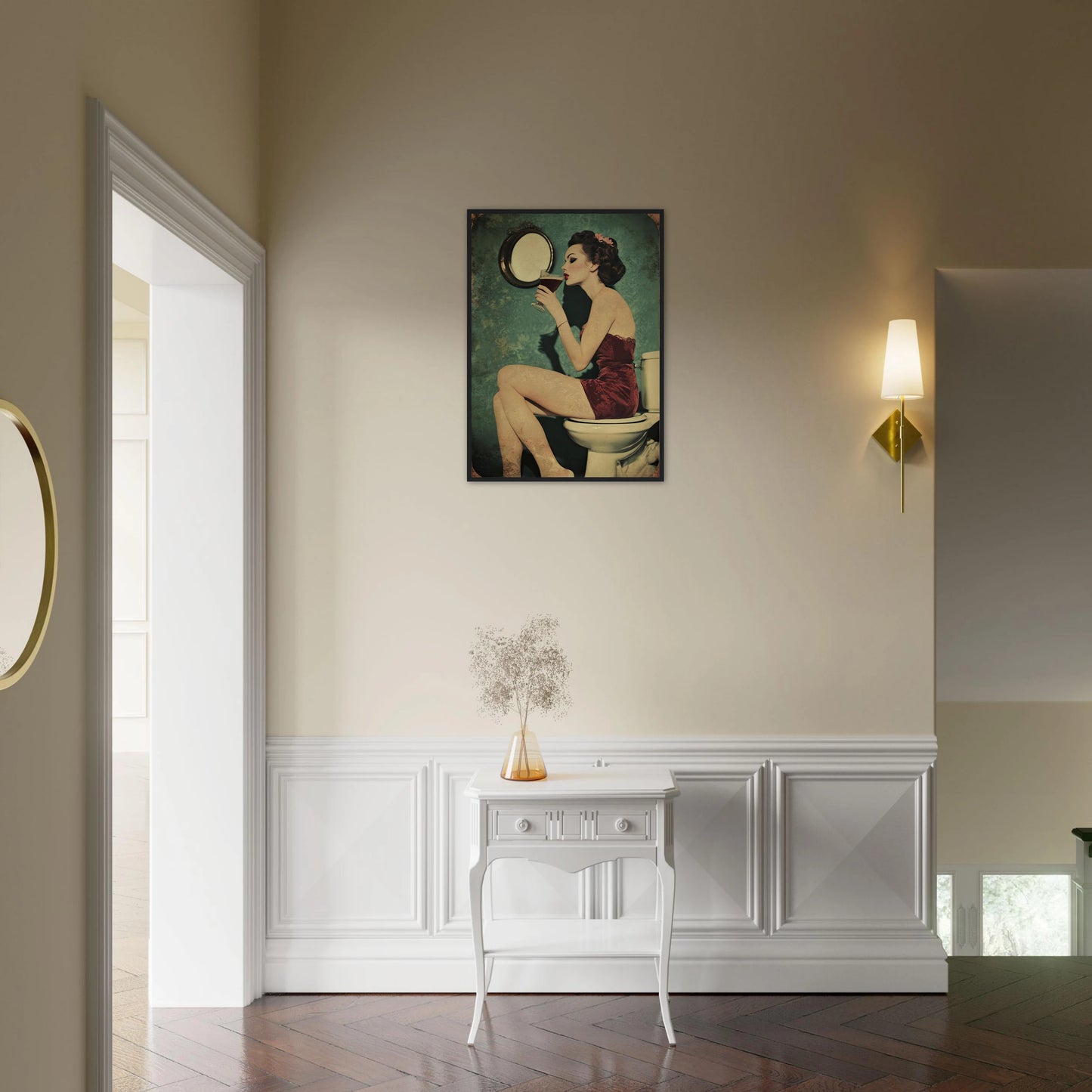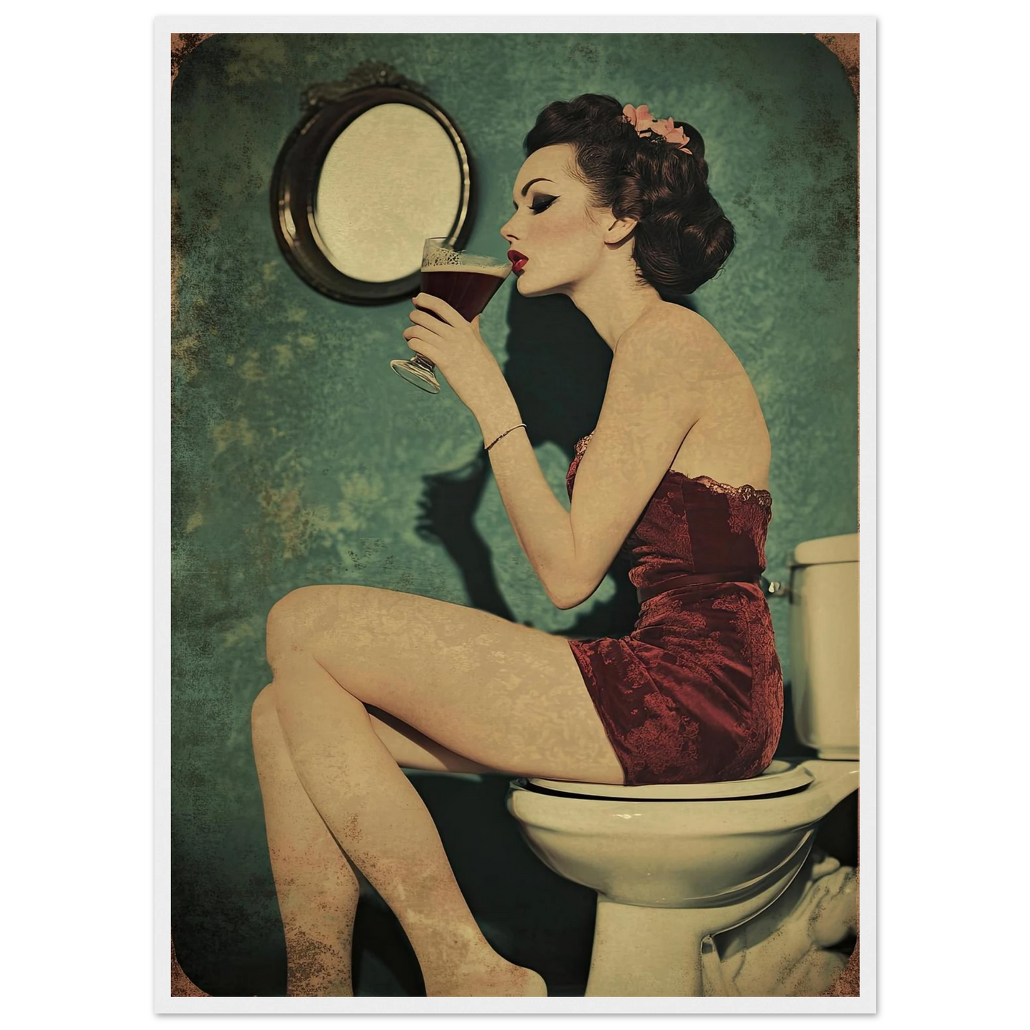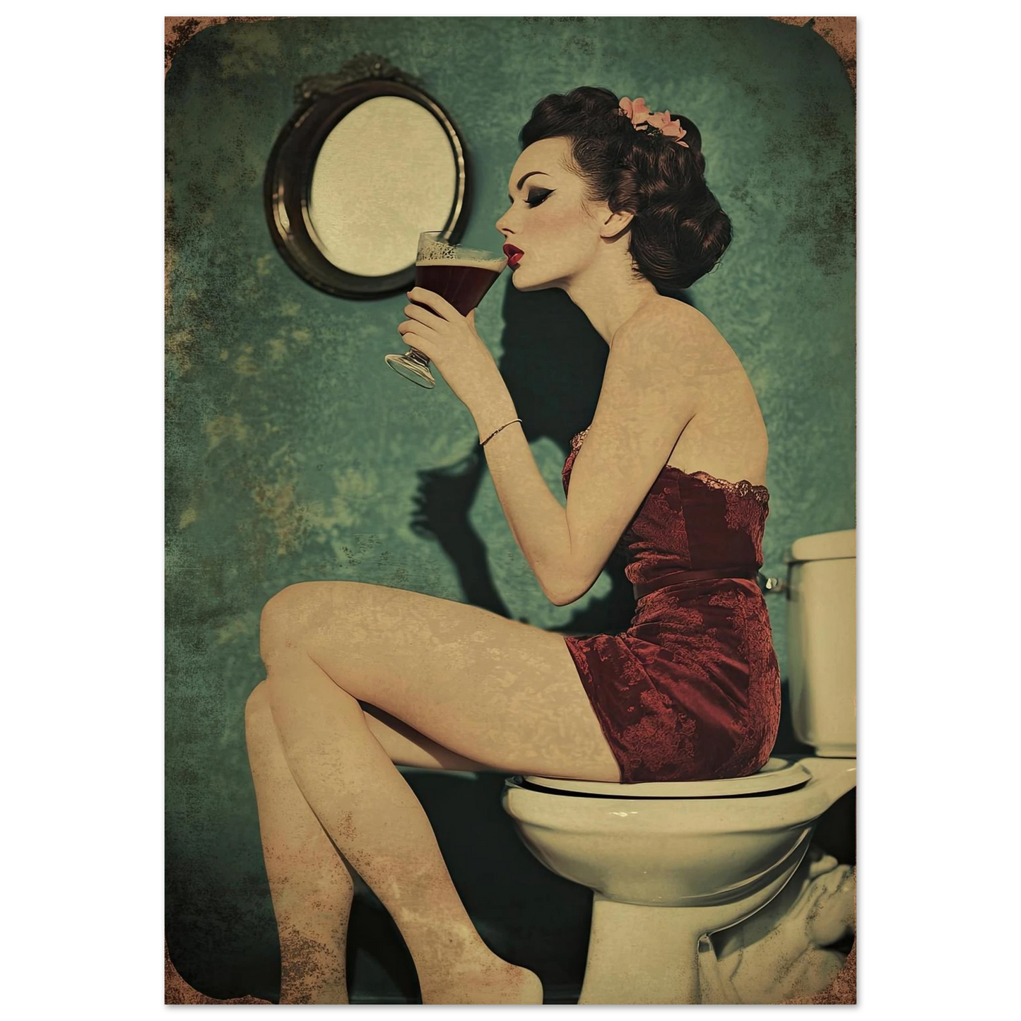 Et dristig vintage-motiv som kombinerer klassisk pin-up-estetikk med en uventet og provoserende setting. Kontrasten mellom elegansen i antrekket, glamouren i posituren og den hverdagslige bakgrunnen gir bildet en unik blanding av humor, stil og attityde. Perfekt kunstverk for deg som ønsker et blikkfang som utfordrer normene og tilfører interiøret en edgy retro-vri.